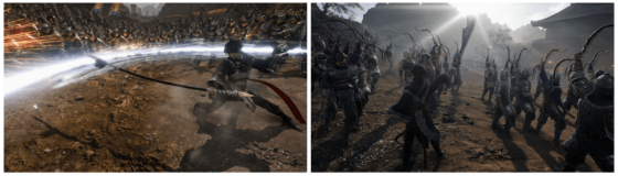 In 1 vs. 1,000 combat, players will have to master and alternate between swift and powerful attacks that can break an opponent’s guard. Repeated attacks will increase the protagonist’s “Bravery”, enabling them to use powerful and unique attacks called “Arts”. These “Arts” will be unique to each weapon, so it will be crucial for players to master the various arsenal at their disposal, allowing the protagonist to gain “Rank” and thus improving their skills.