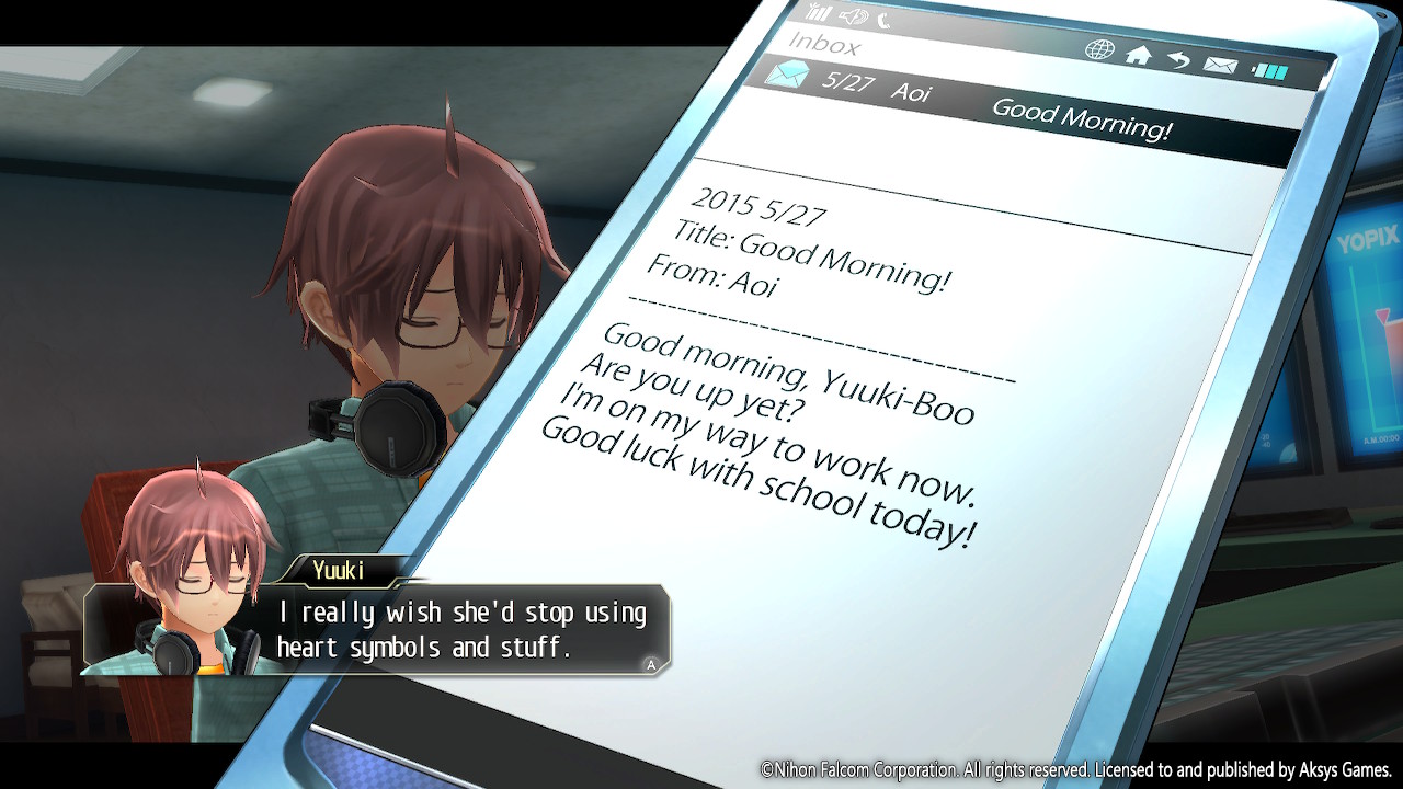 First up, let’s talk a bit about the revised localization. Now it’s been a hot minute since I played the Vita version, but I did notice the tone of this release is more inline with what you see from other Falcom games. The terminology matches up with what I’ve seen in the Trails series, so I think this adds consistency to these releases, which is a good thing. I did notice a few errors here and there like the one pictured below. If the text is complaining about emotes, you should probably actually put them in the text on the phone. That said, overall I think the team did a pretty good job here, outside of a few glaring errors.